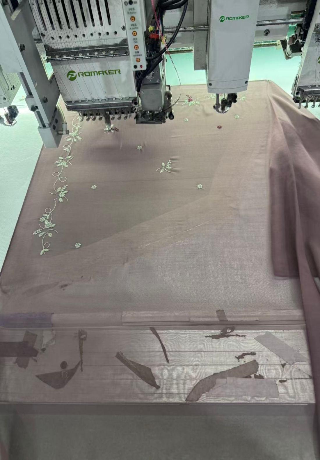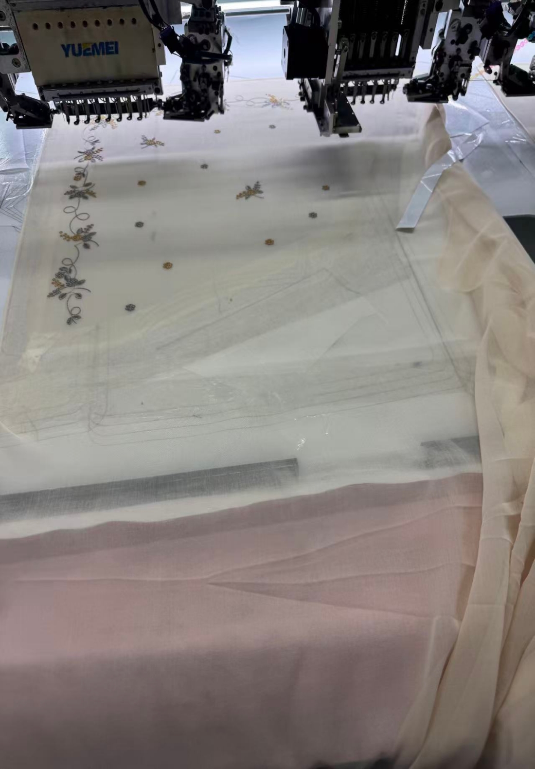 Embroidery expertise — digital pattern sampling, multiple thread colors (including gold/silver), lace or bead trim available.